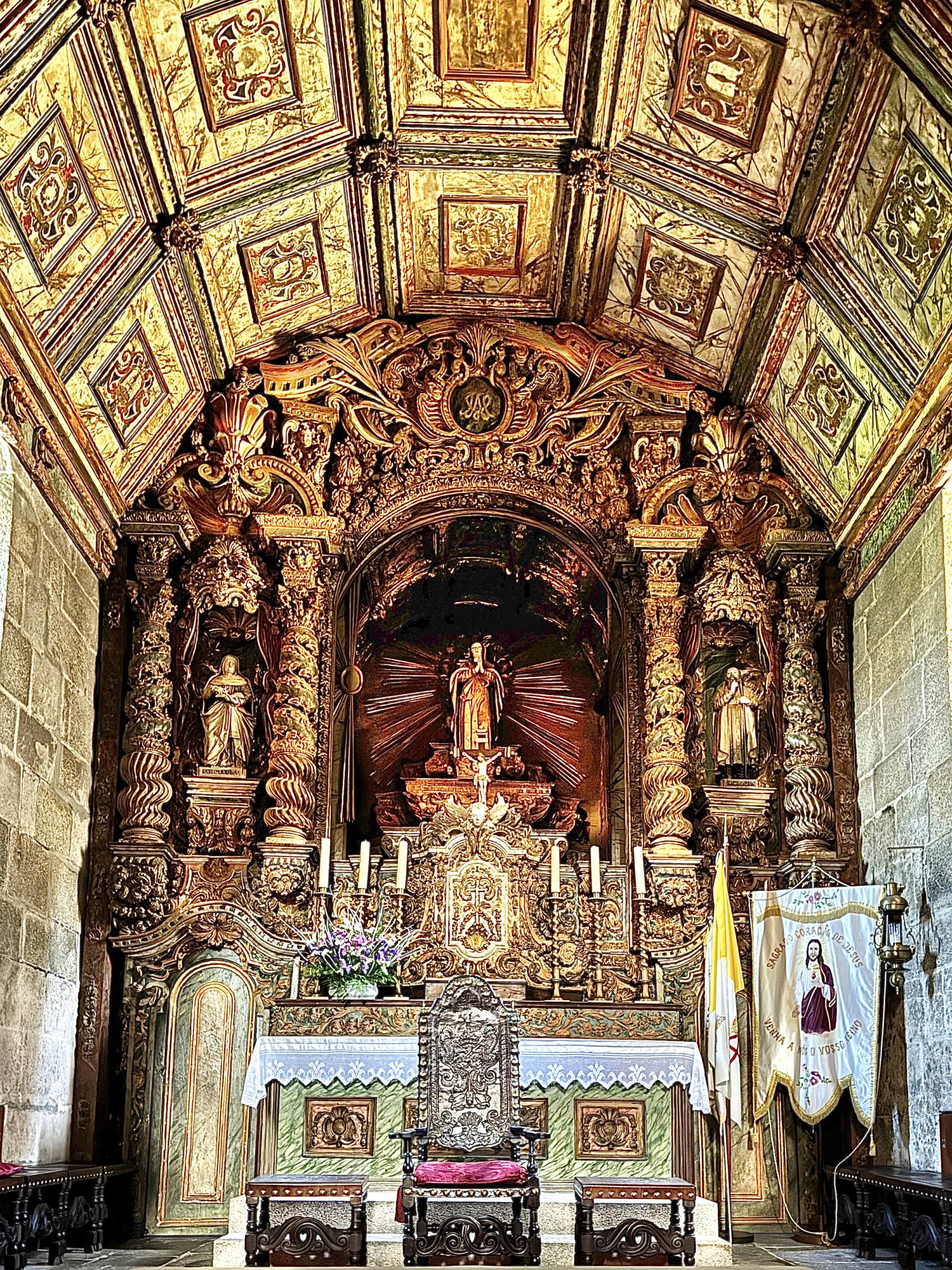 Inside, the focal point is the altar-mor, richly carved and gilded, flanked by Solomonic columns that twist upward, drawing your gaze to the heavens. It’s worth knowing: while the interior is less accessible (the building is publicly visible but interior visits may be limited), the striking exterior tiles and façade are fully on display as you pass by.
