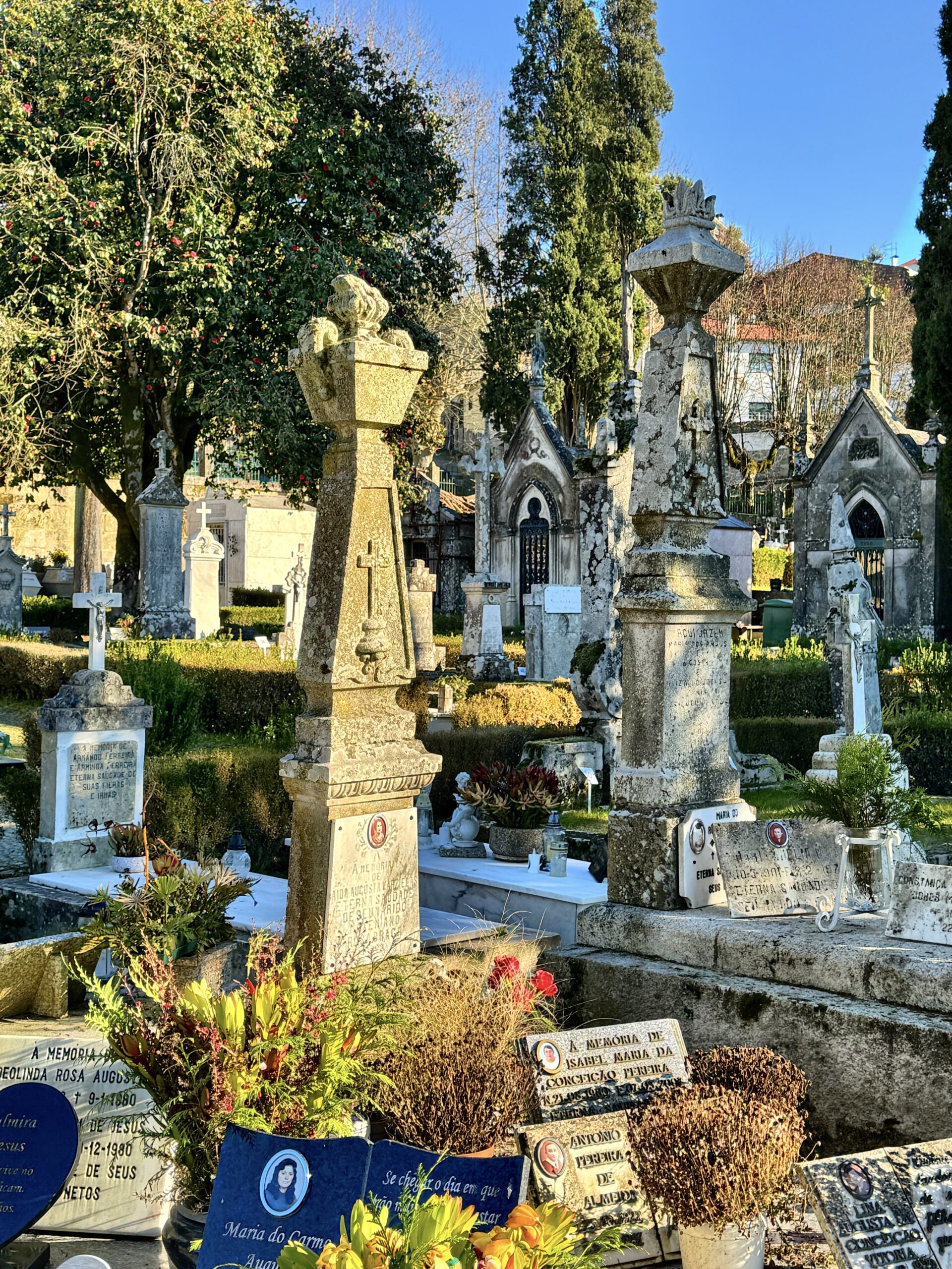 The Igreja Matriz, or Church of Nossa Senhora da Assunção, anchors the town — a gentle blend of Romanesque solidity and Gothic grace. Its freestanding bell tower watches over the square, while beside it lies an above-ground cemetery, white marble tombs gleaming in the sunlight.