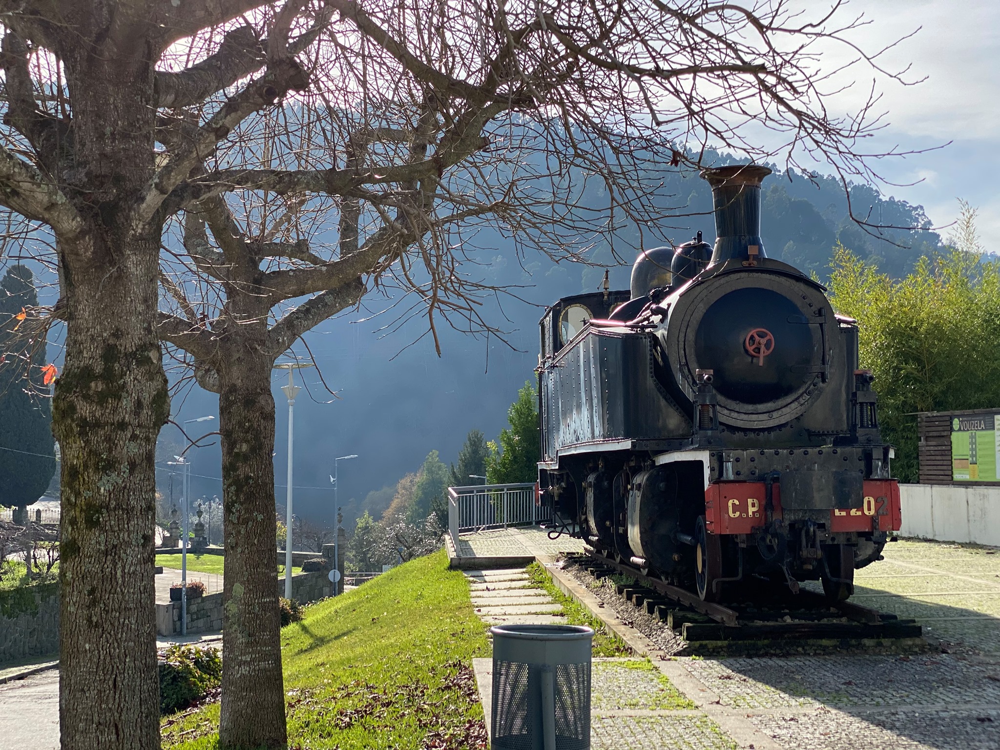 Safely on the far side of the viaduct, the old Vouzela station comes into view, still dignified in its stone and tile. A black steam locomotive stands nearby – polished, motionless, almost proud – as if waiting for a whistle that will never come.